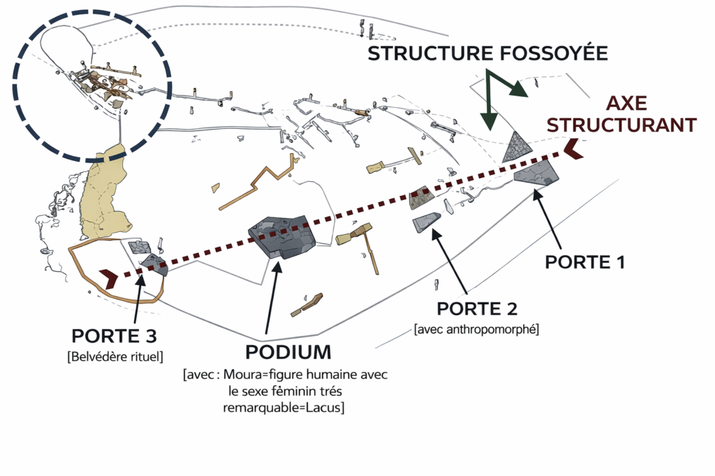 Este santuario contaba con tres rudimentarias puertas talladas en la piedra, alineadas en un eje de simetría norte-sur, un rasgo que se repite en diversos elementos simbólicos, especialmente en los petroglifos.
