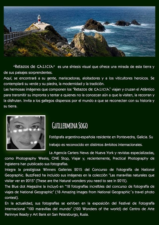 Las imágenes que componen los “Retazos de Galicia” viajan y cruzan el Atlántico para transmitir su impronta y tentar a quienes no la conozcan aún, a que la visiten, la recorran y la disfruten. También invita a los gallegos dispersos por el mundo a que se reconecten con su historia y su tierra. Guillermina»
